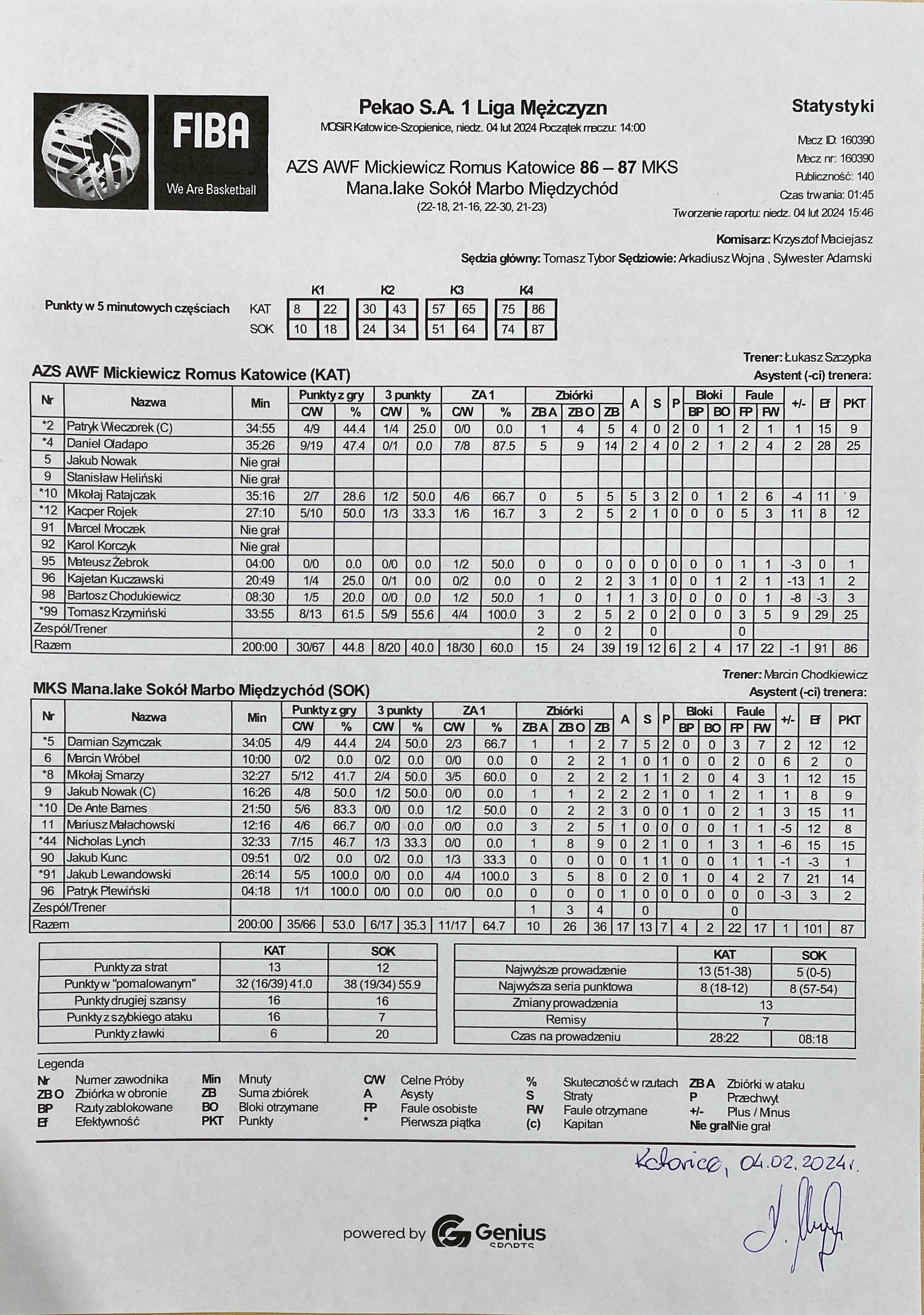 Sędziowie: Tomasz Tybor, Arkadiusz Wojna, Sylwester Adamski | Komisarz: Krzysztof Maciejasz