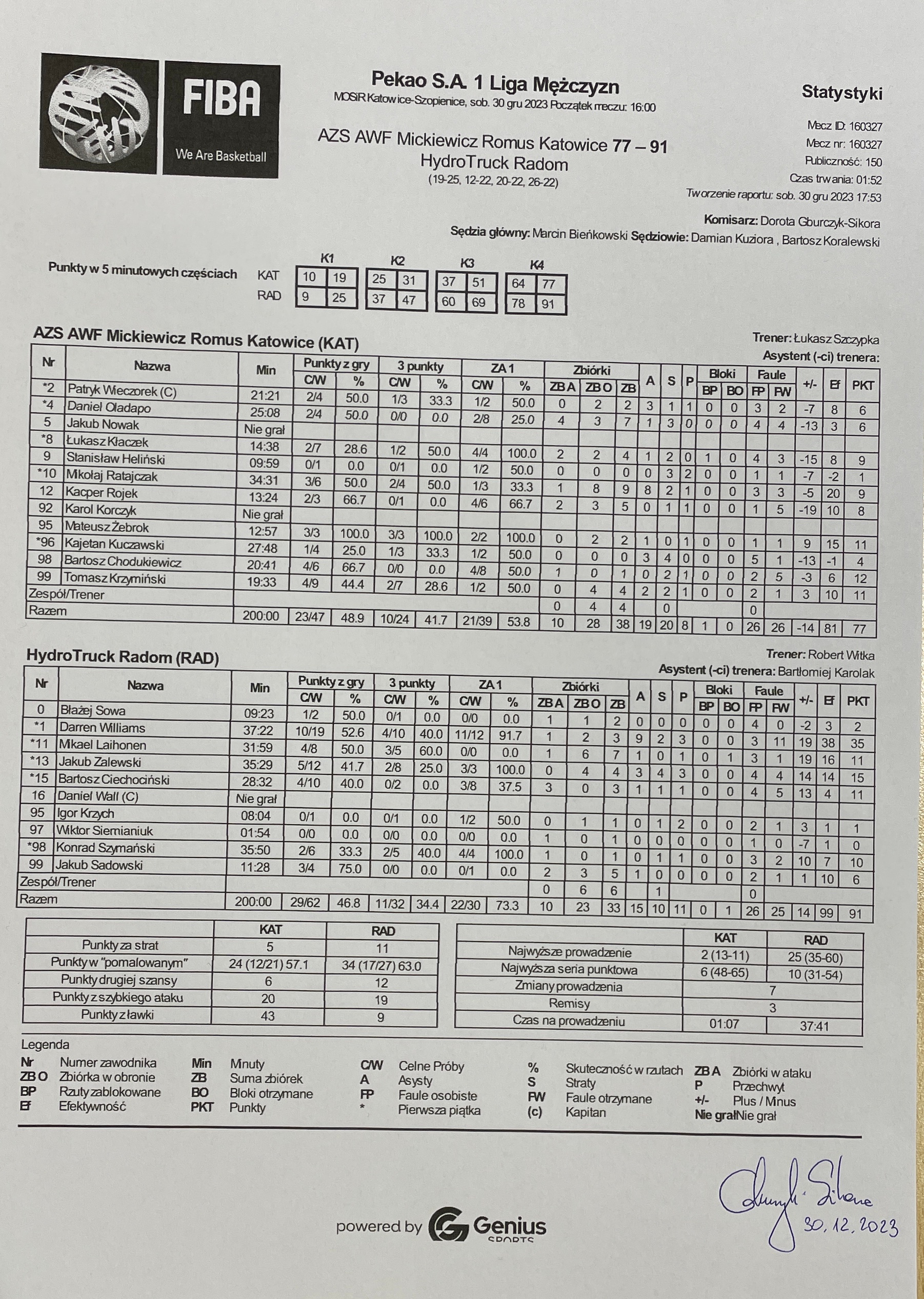 Sędziowie: Marcin Bieńkowski, Damian Kuziora, Bartosz Koralewski | Komisarz: Dorota Gburczyk-Sikora